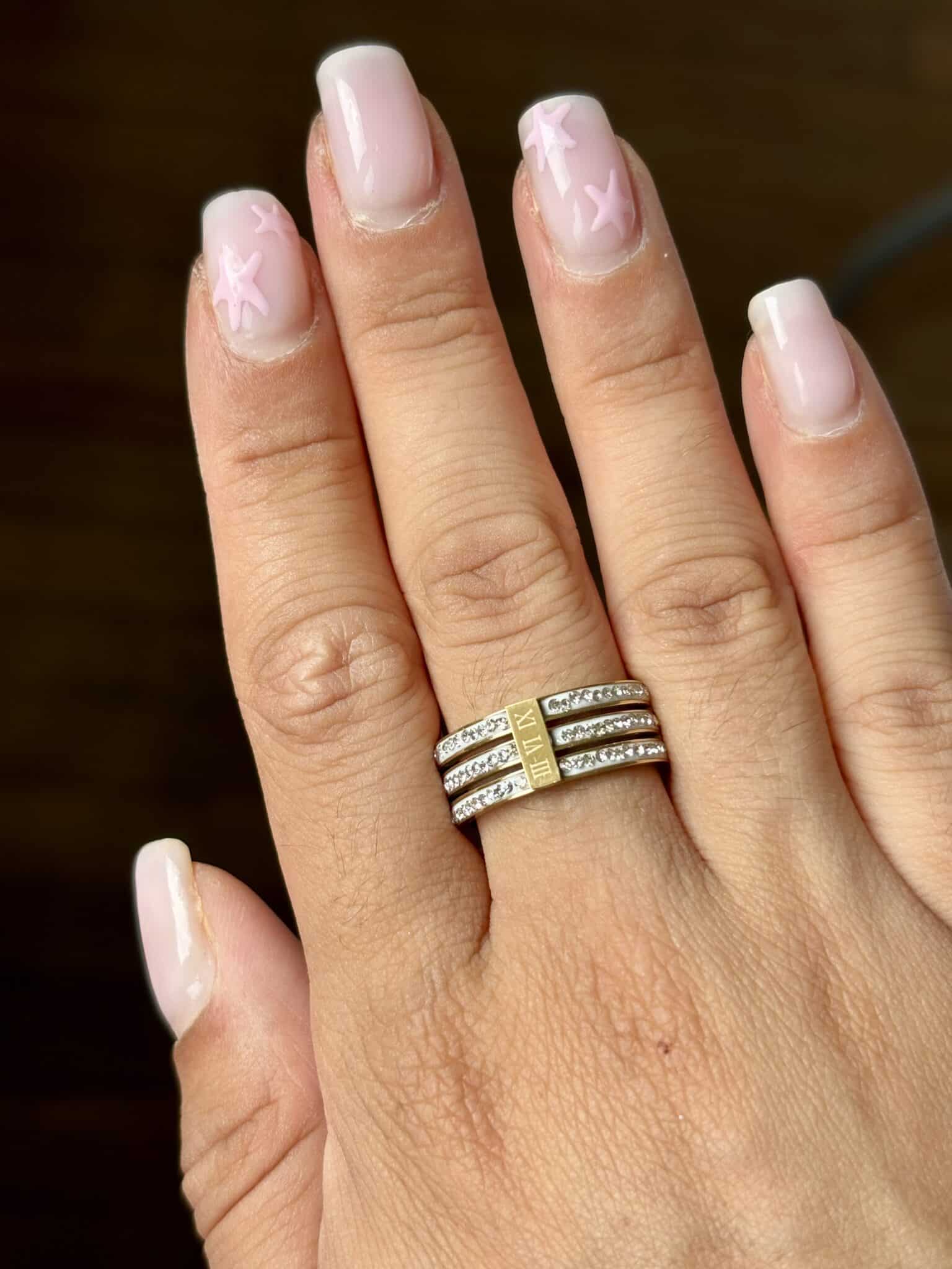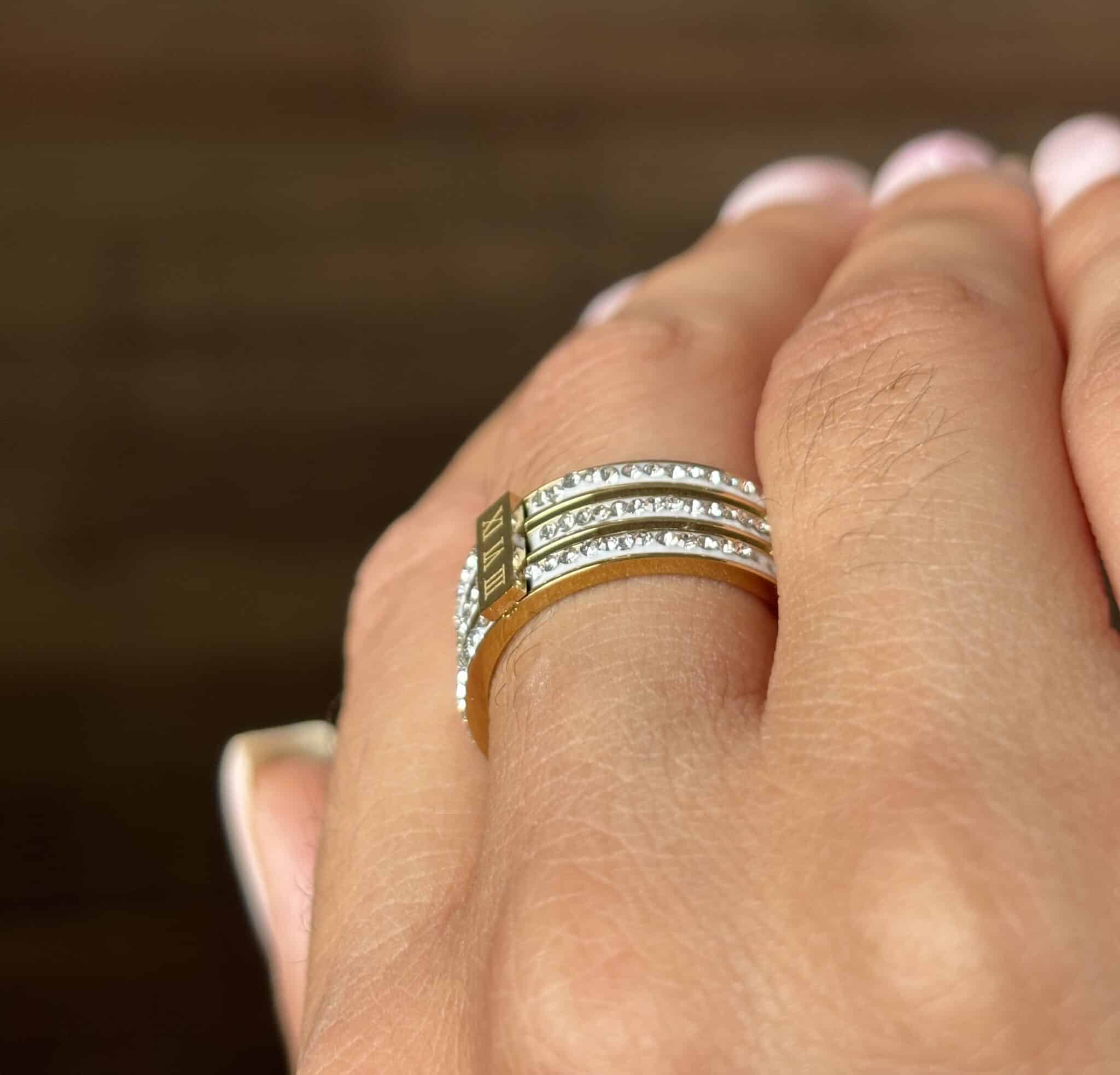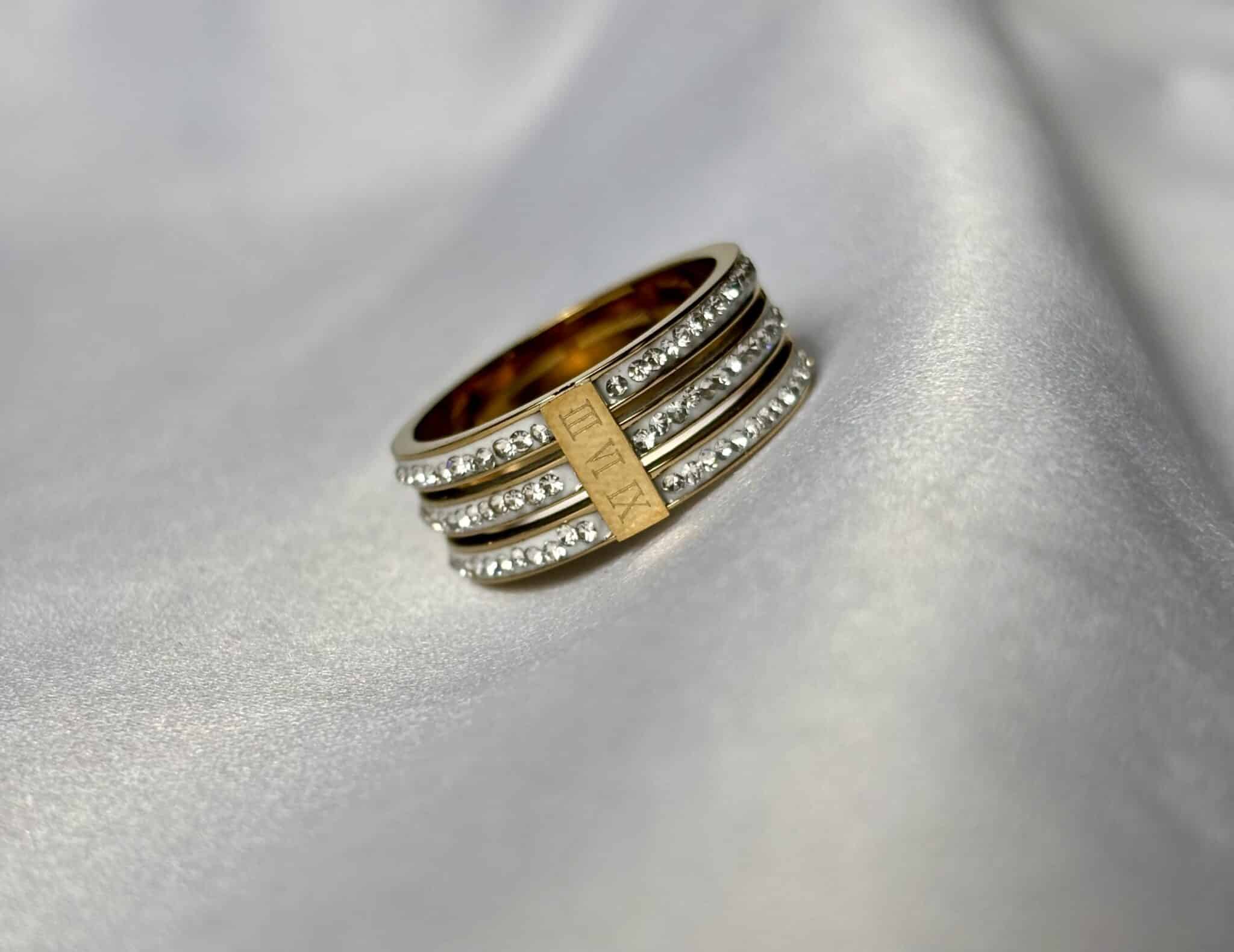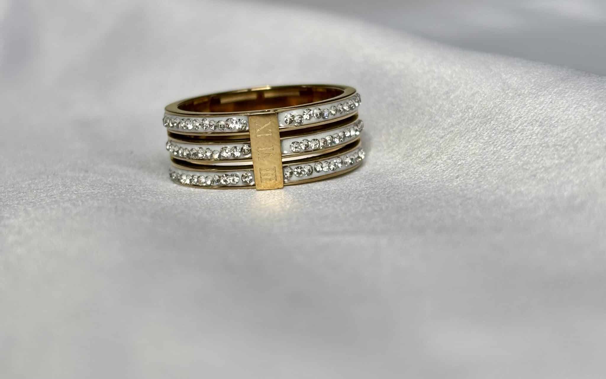 La bague Anna en acier sertis d’oxydes de zirconium.