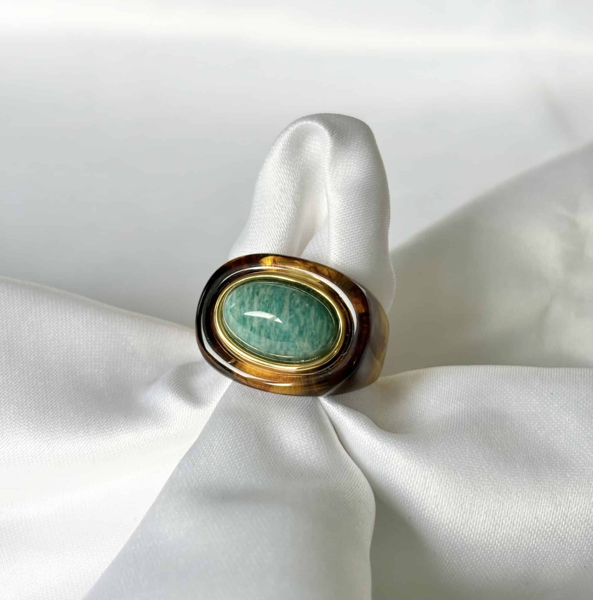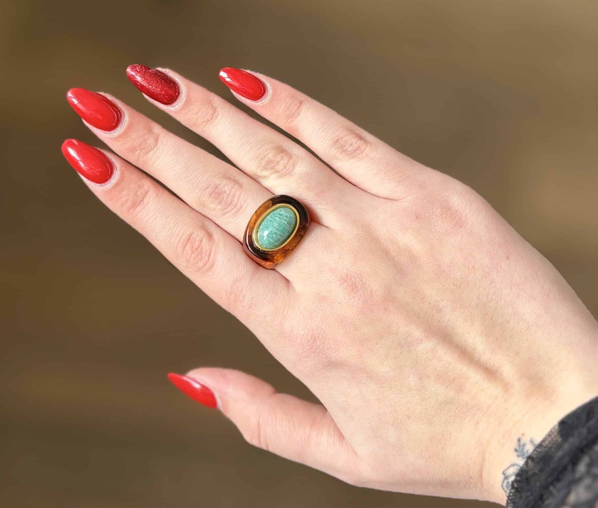 La bague Lucas Jack Leicester en plaqué or 18 k recyclé et une magnifique résine très délicate. Elle est très agréable à porter