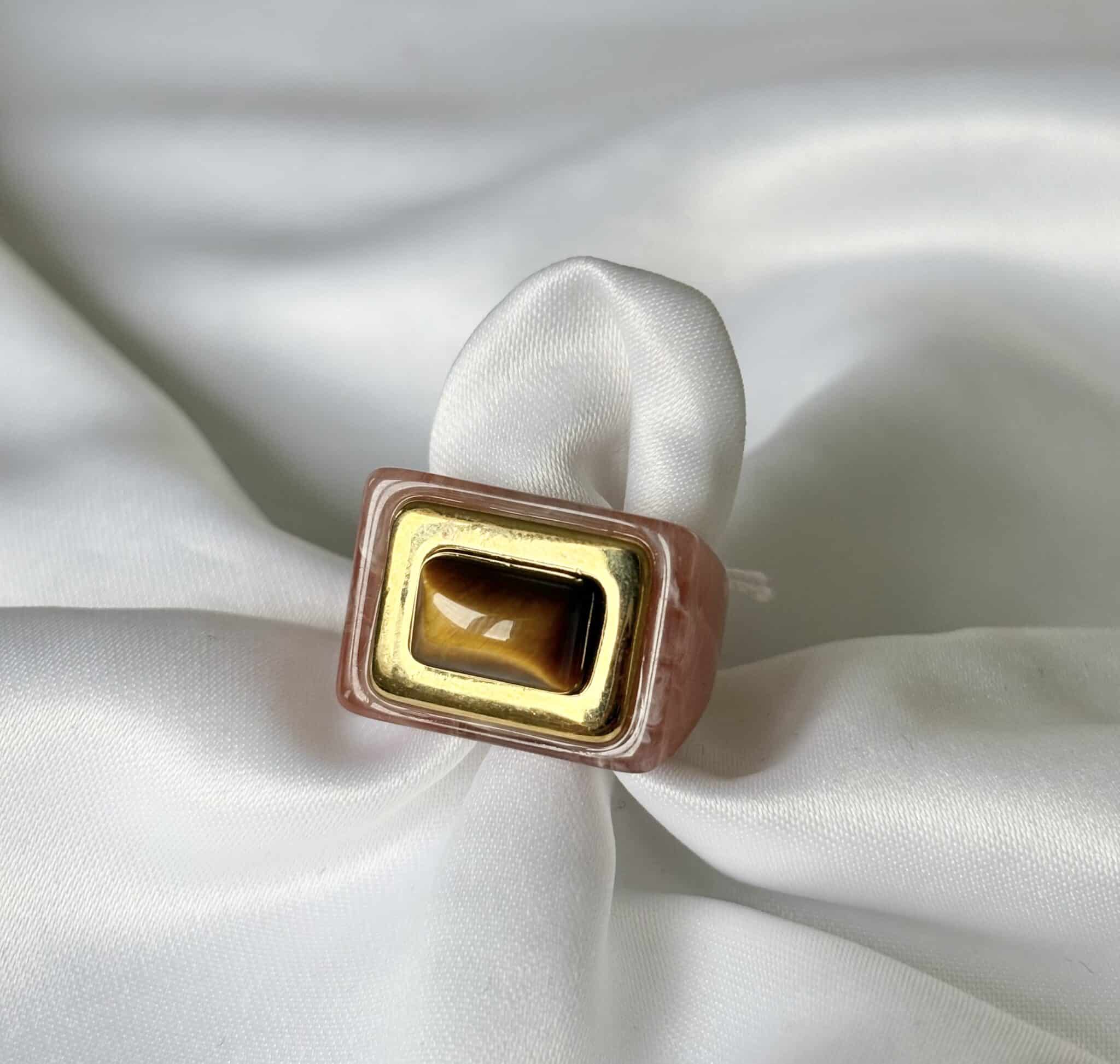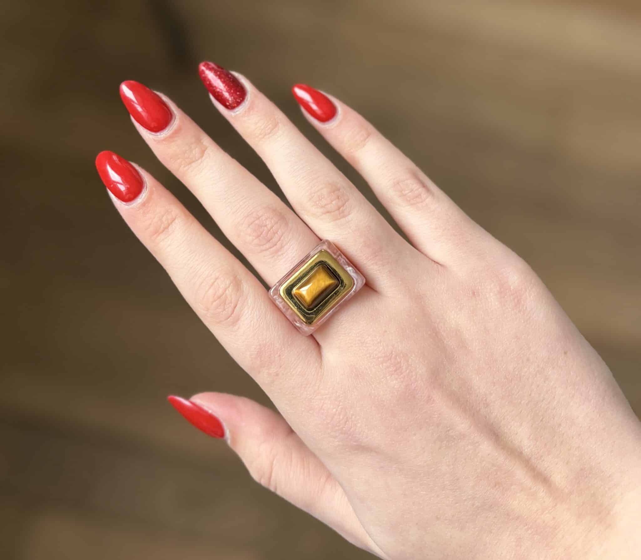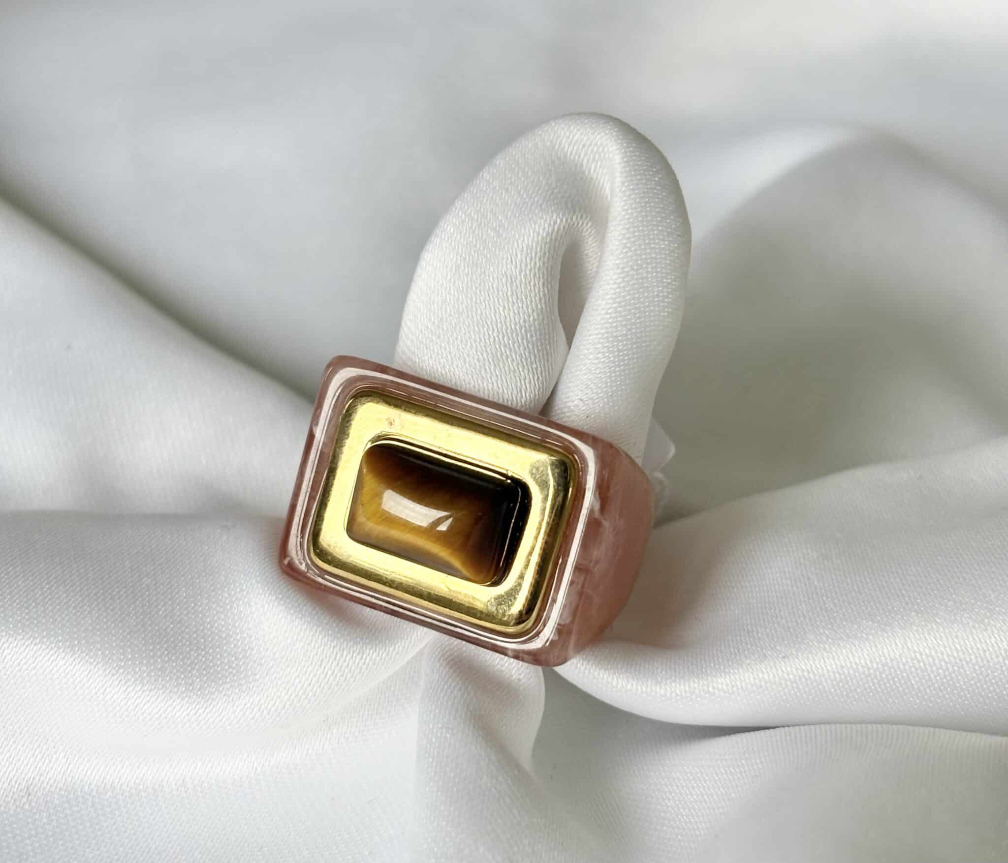 La bague Lucas Jack Lorenza en plaqué or 18 k recyclé et une magnifique résine très délicate. Elle est très agréable à porter