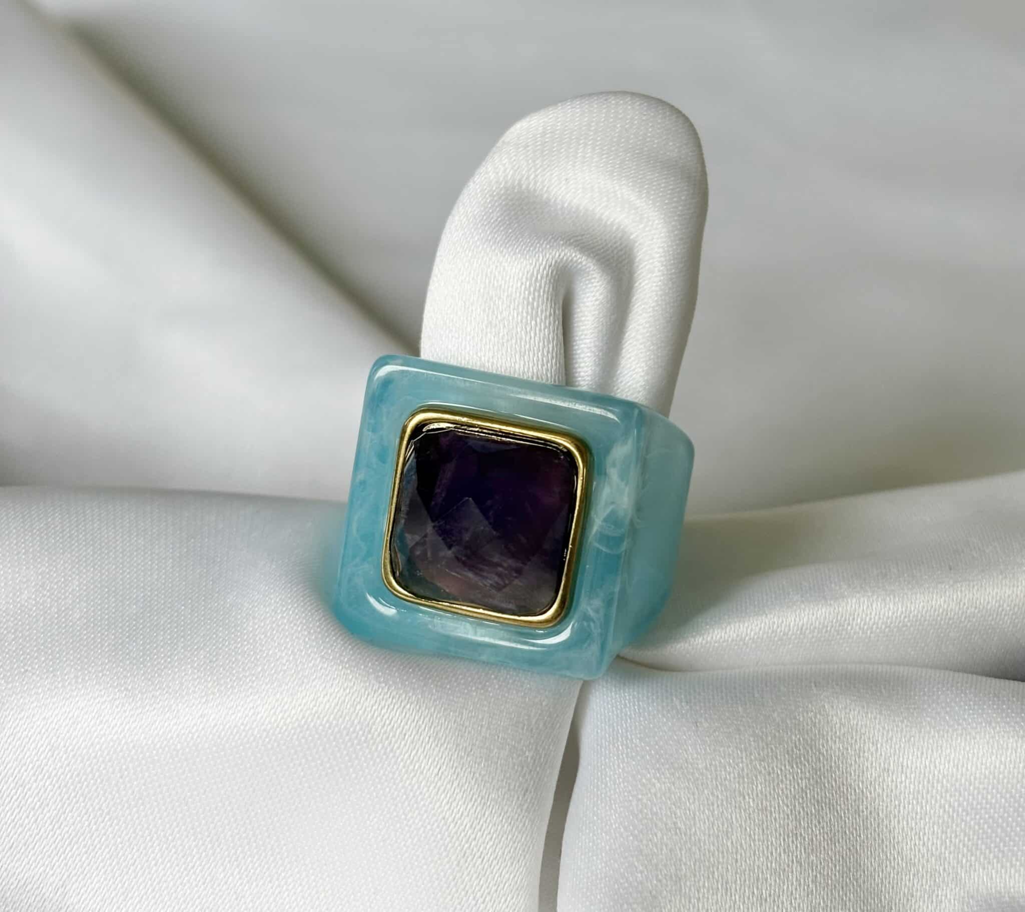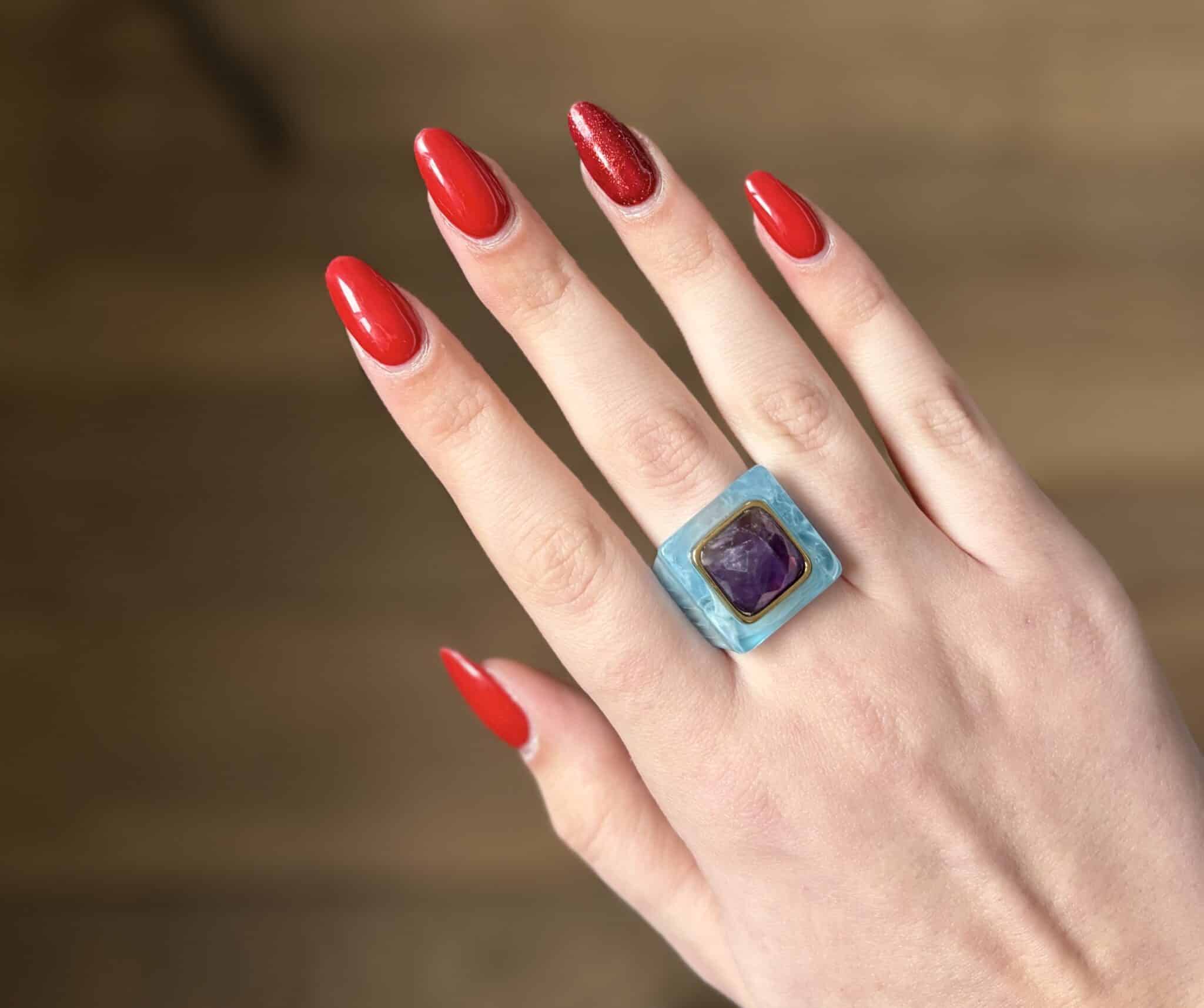 La bague Lucas Jack Lydinia en plaqué or 18 k recyclé et une magnifique résine très délicate. Elle est très agréable à porter.