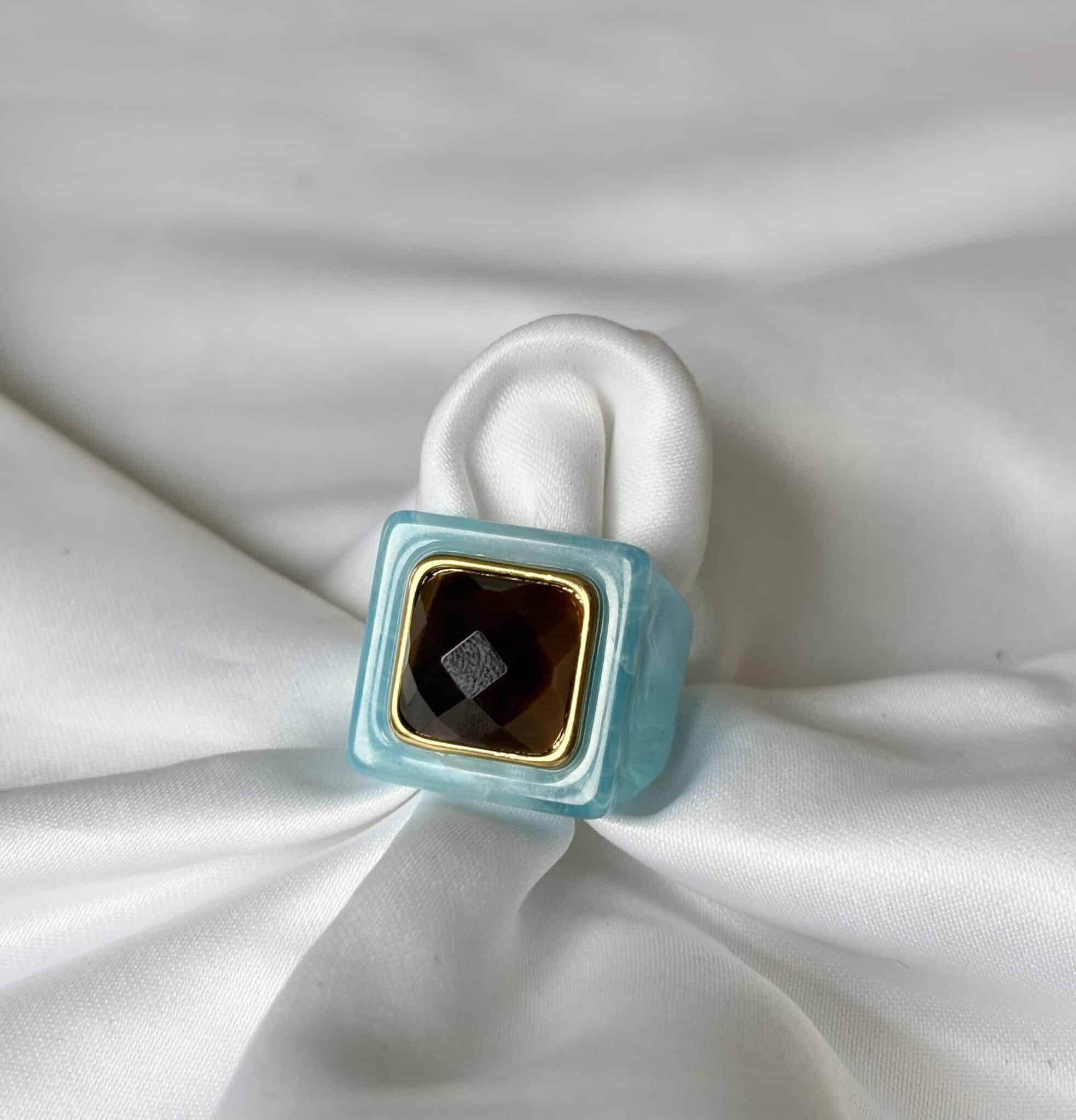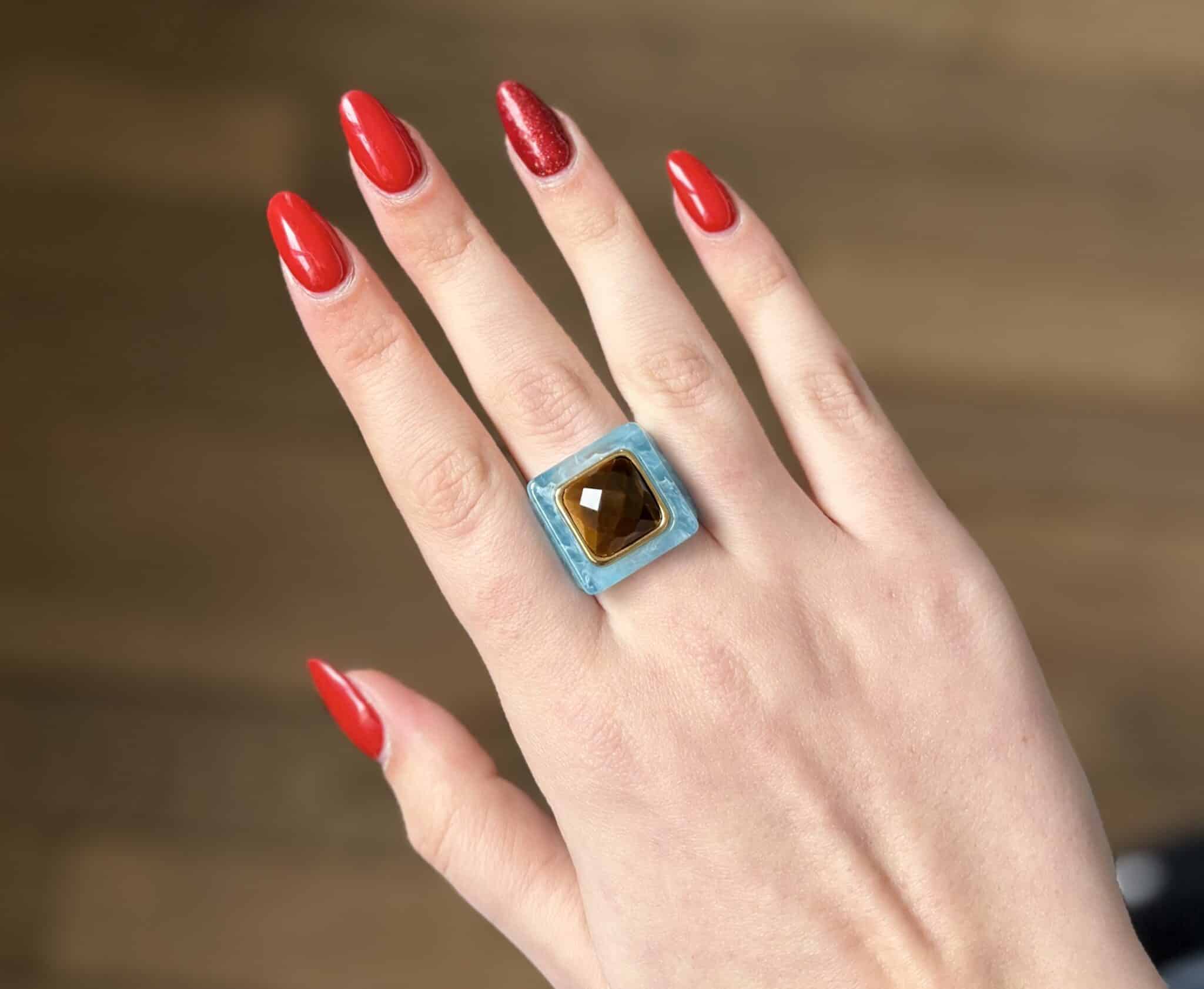 La bague Lucas Jack Lydinia en plaqué or 18 k recyclé et une magnifique résine très délicate. Elle est très agréable à porter.