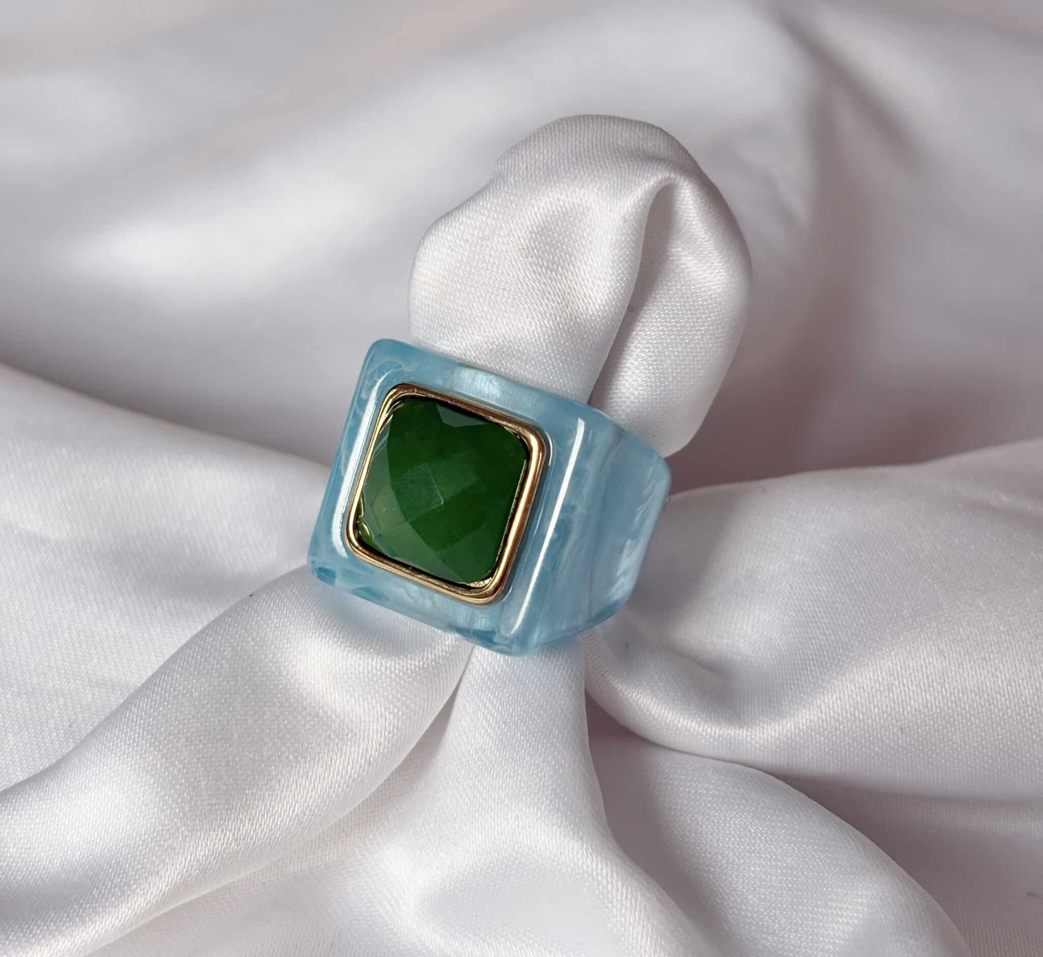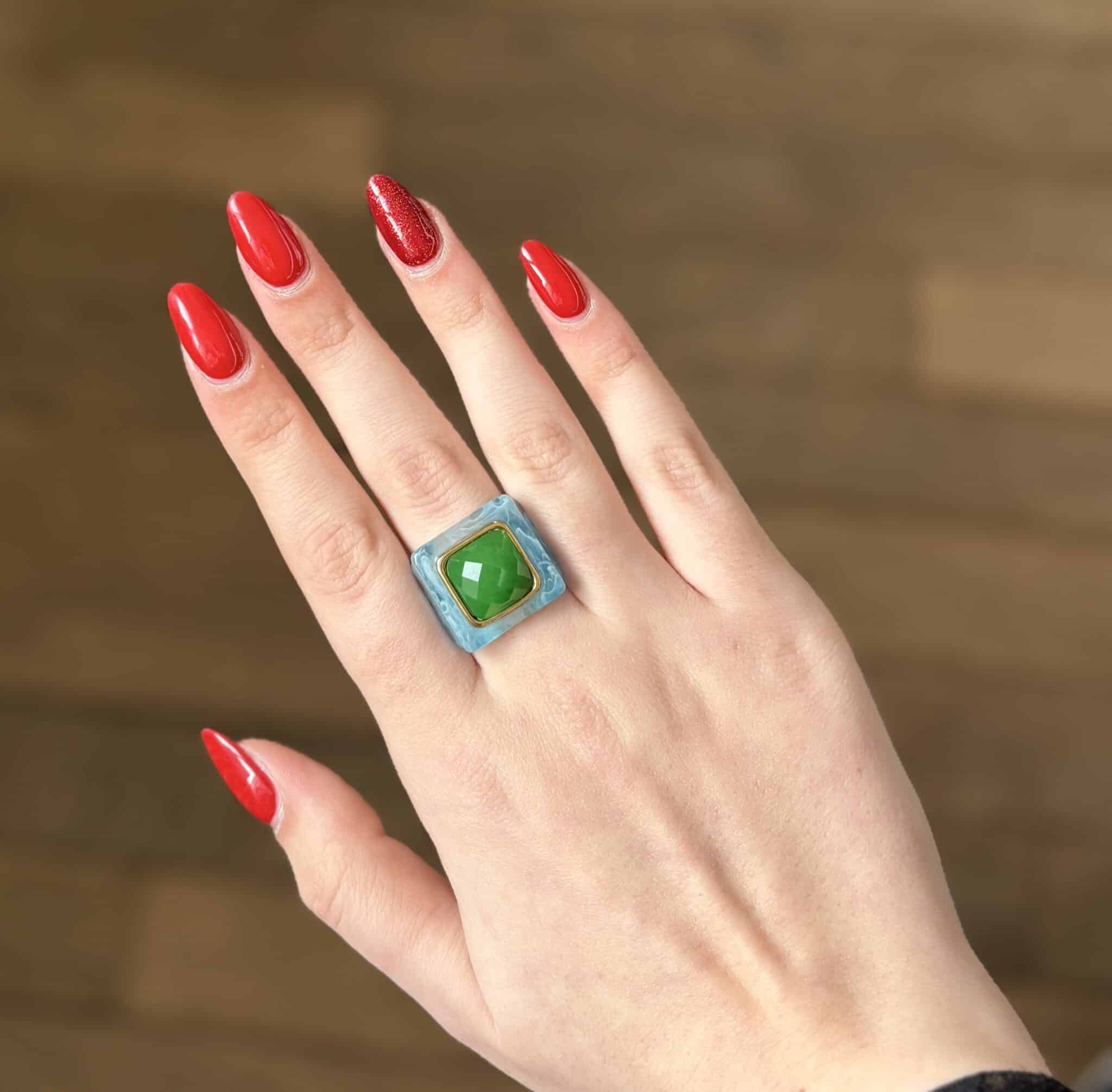 La bague Lucas Jack Lydinia en plaqué or 18 k recyclé et une magnifique résine très délicate. Elle est très agréable à porter.