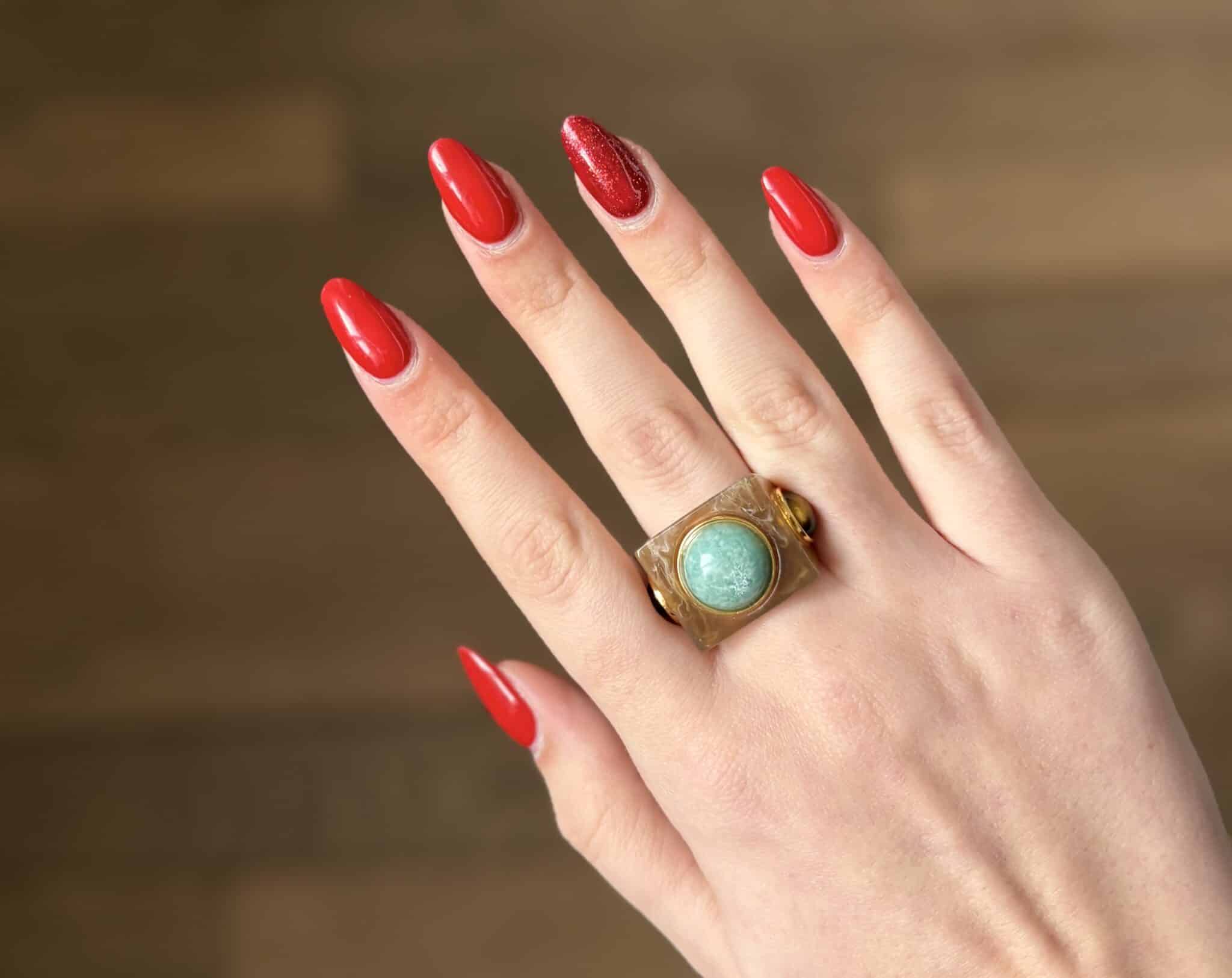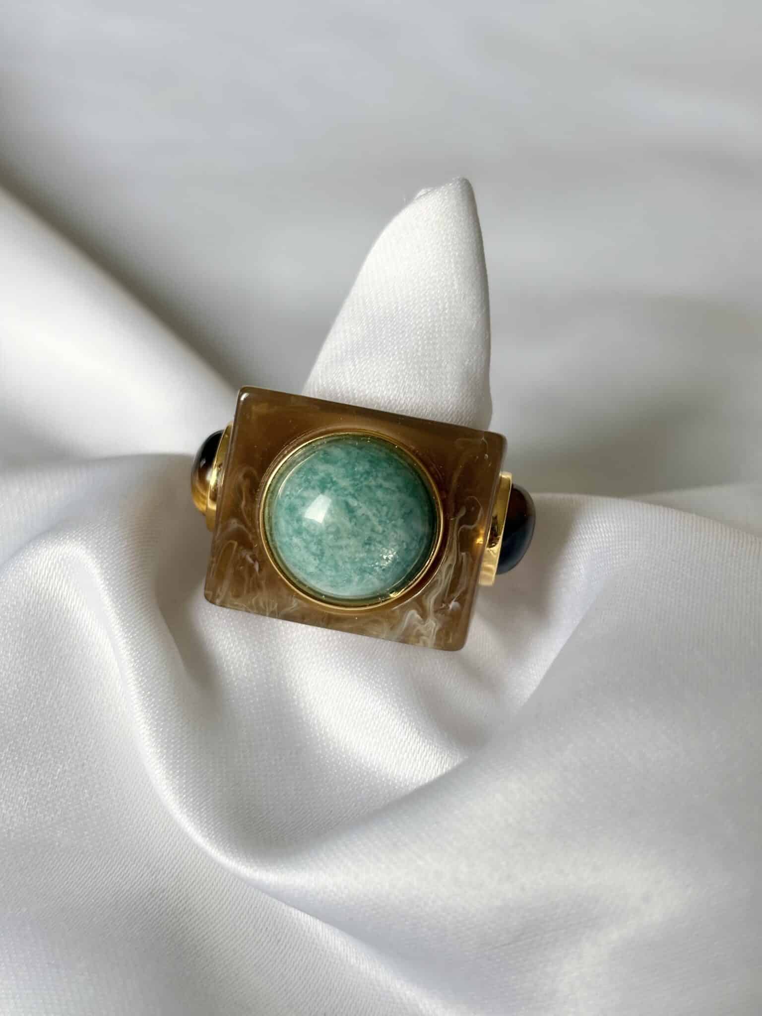 La bague Lucas Jack Lyndia en plaqué or 18 k recyclé et une magnifique résine très délicate. Elle est très agréable à porter