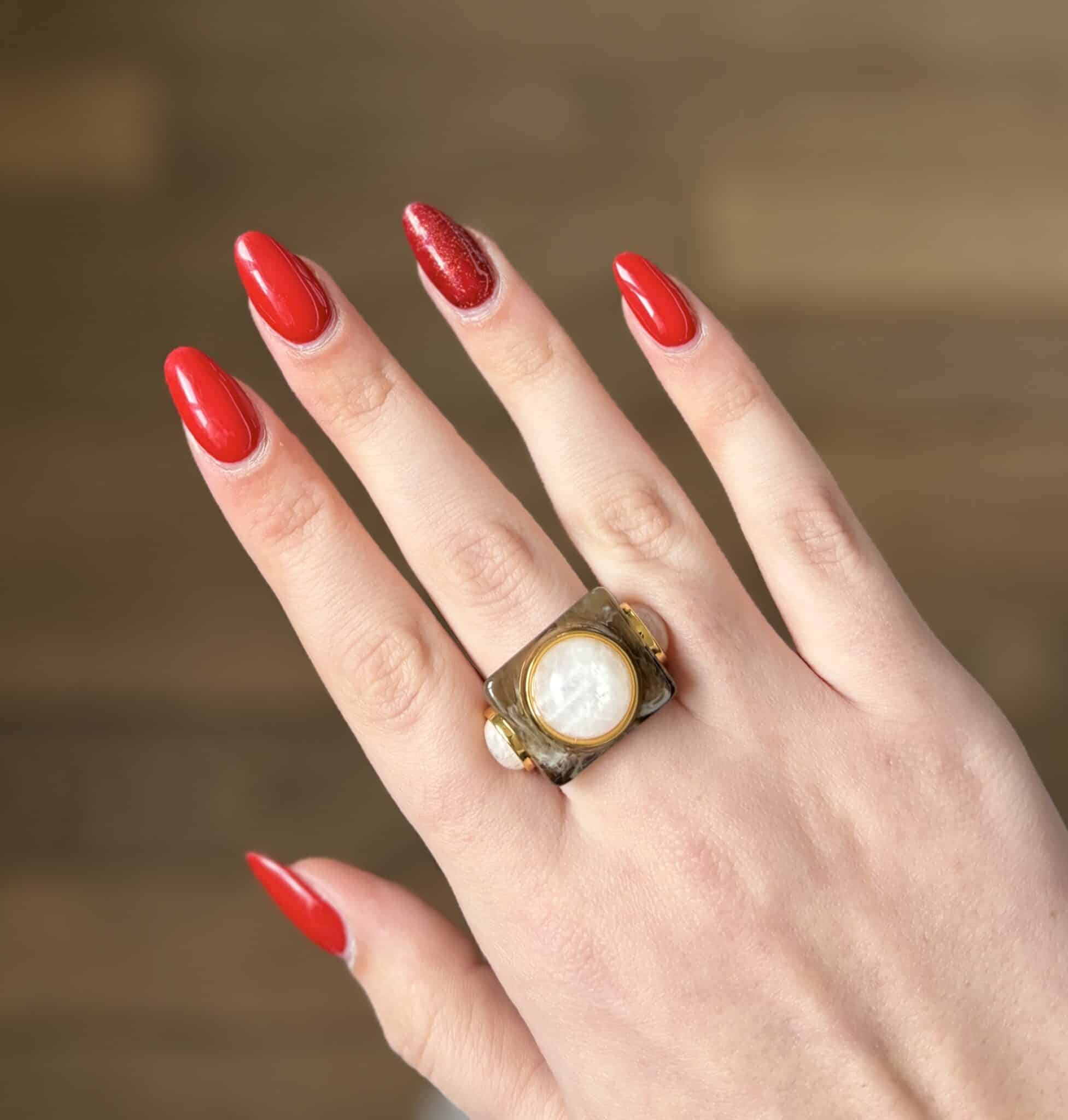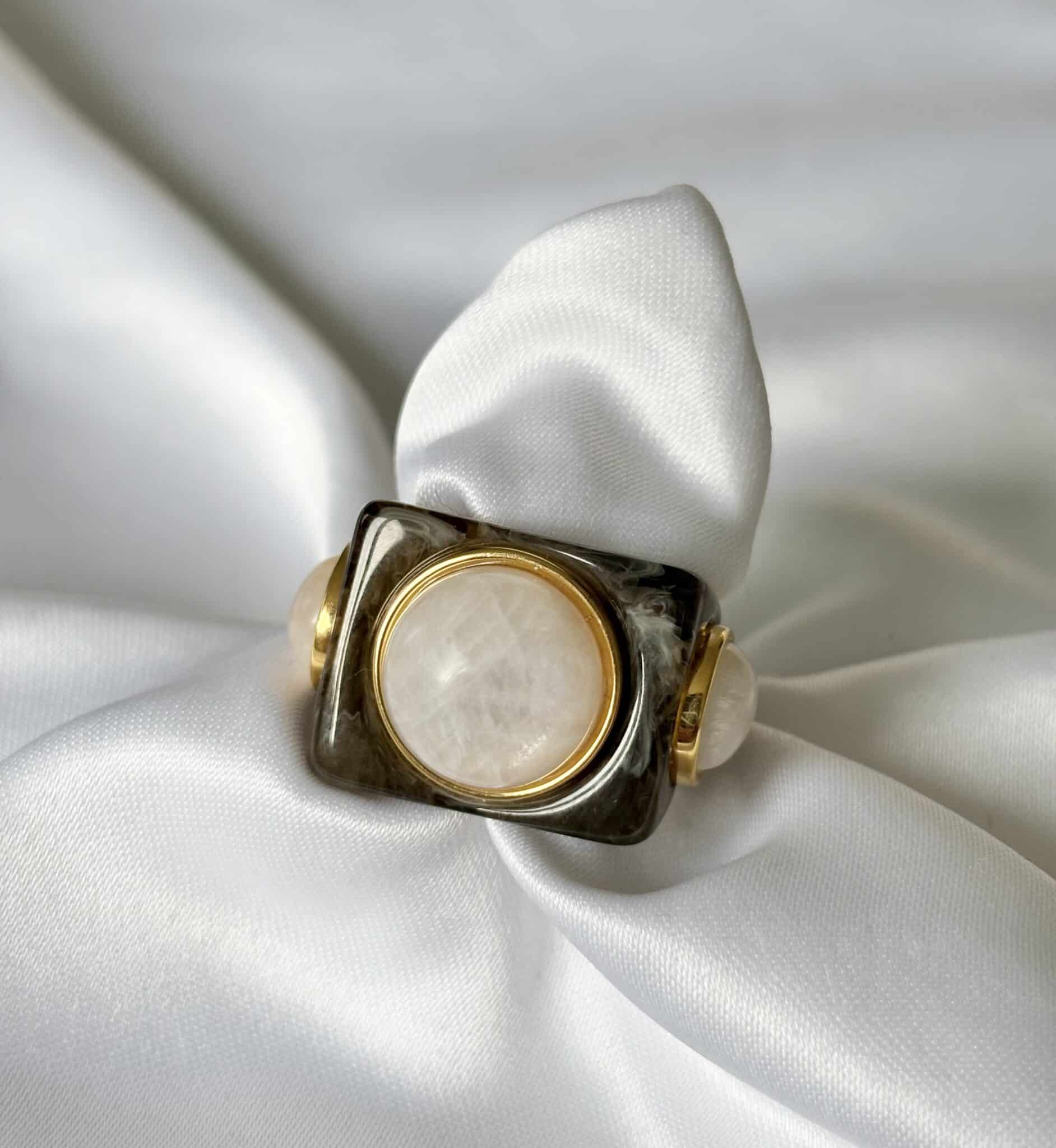 La bague Lucas Jack Lyndia en plaqué or 18 k recyclé et une magnifique résine très délicate. Elle est très agréable à porter