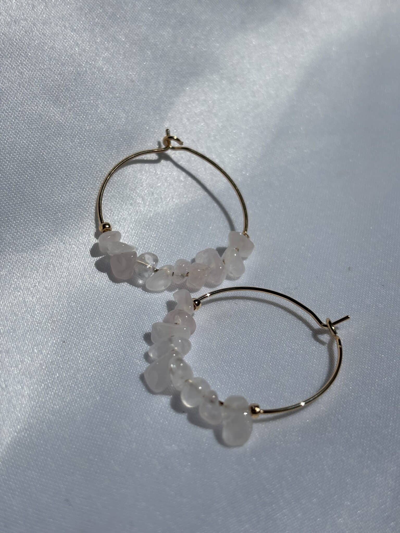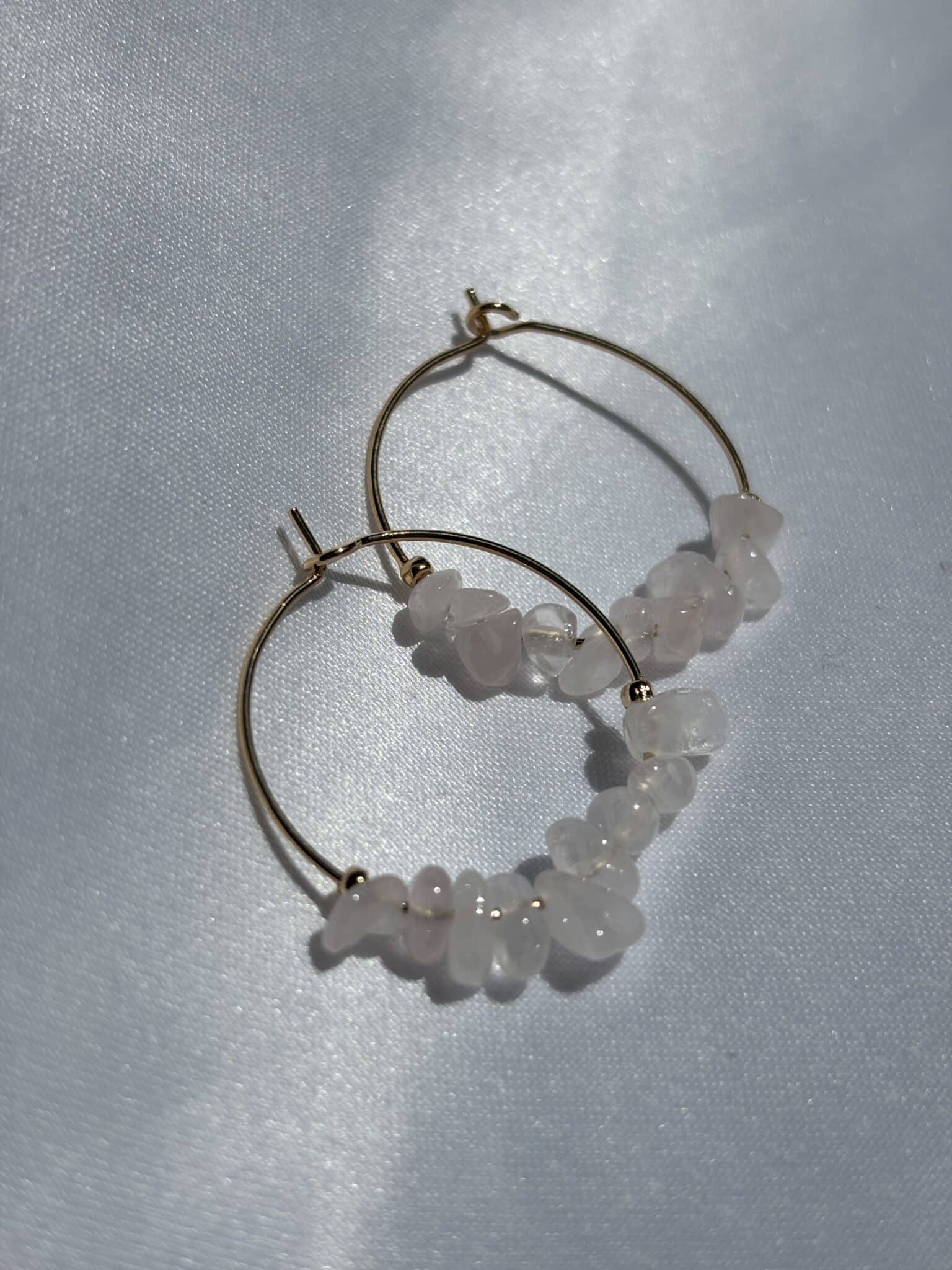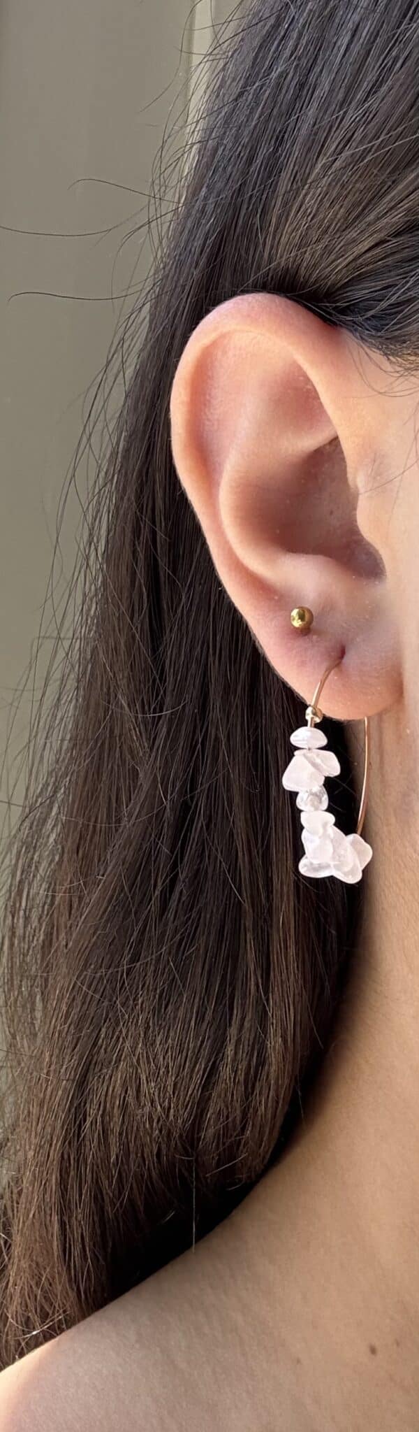 Les créoles Amayi en pierres fines de quartz rose en plaqué or 18K, un bijou qui rayonne d’élégance.