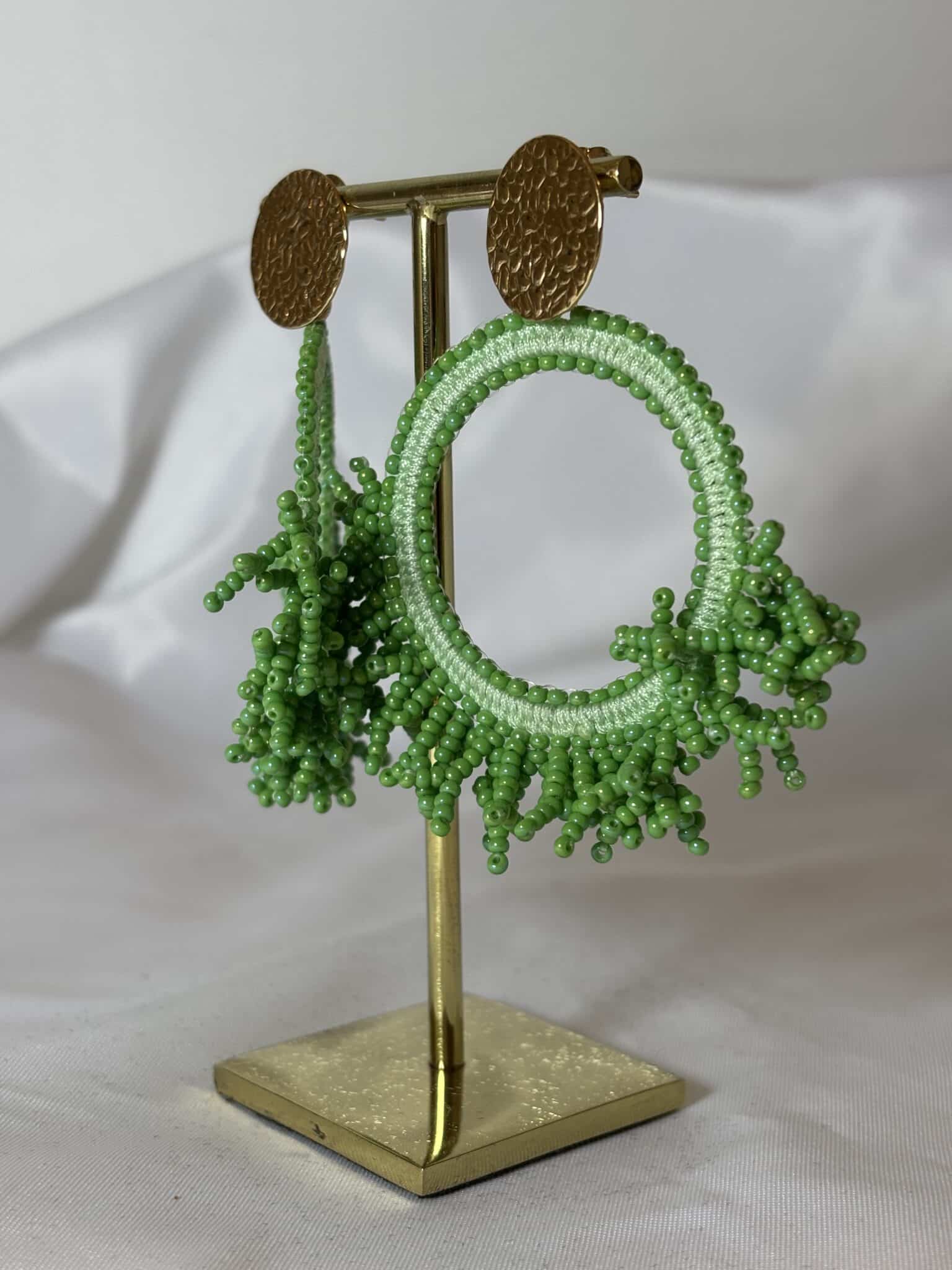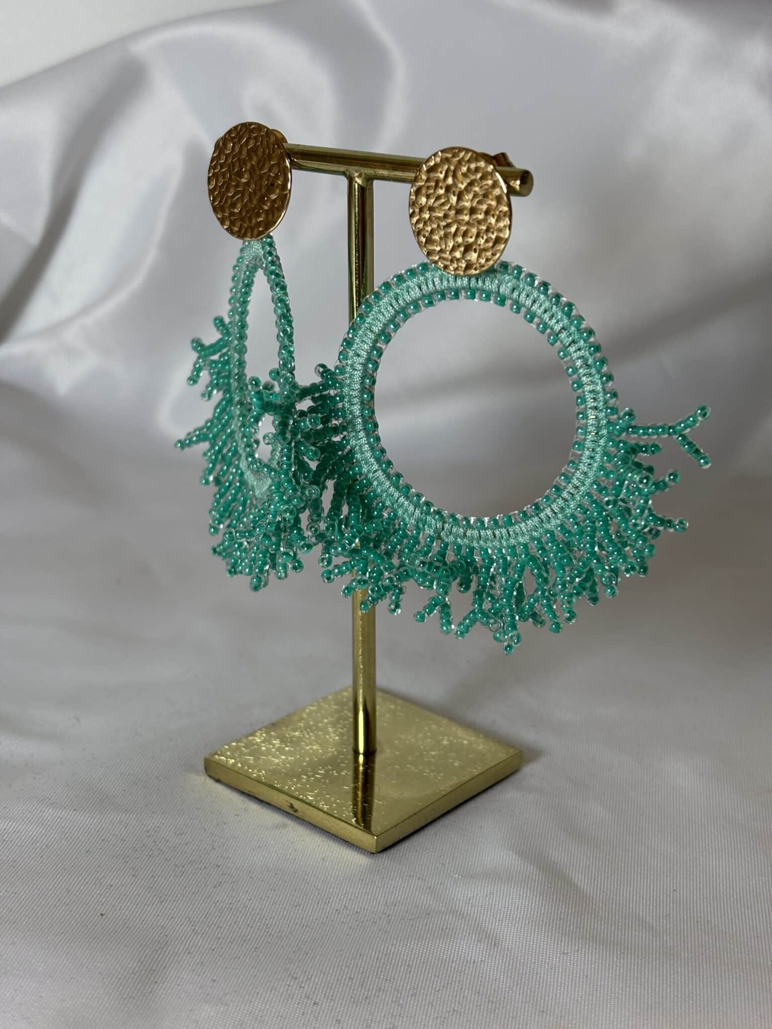 Les boucles d’oreilles Maxi Pacifico de chez Santibé sont façonnées à la main, mêlant avec finesse perles de verre et plaqué or martelé.