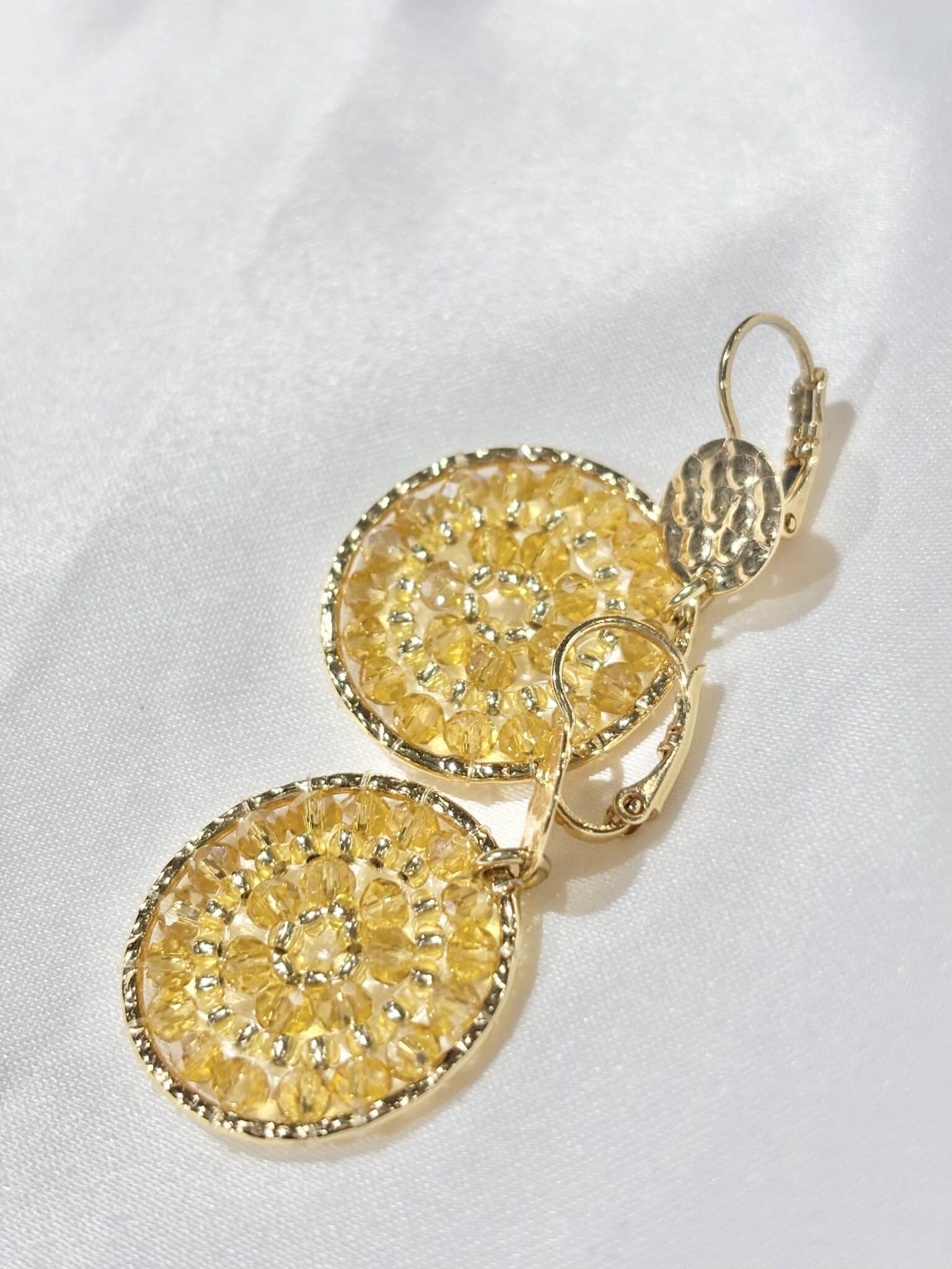 Les boucles d’oreilles Paradis de chez Santibé sont façonnées à la main, mêlant délicatement perles de verre et plaqué or martelé.