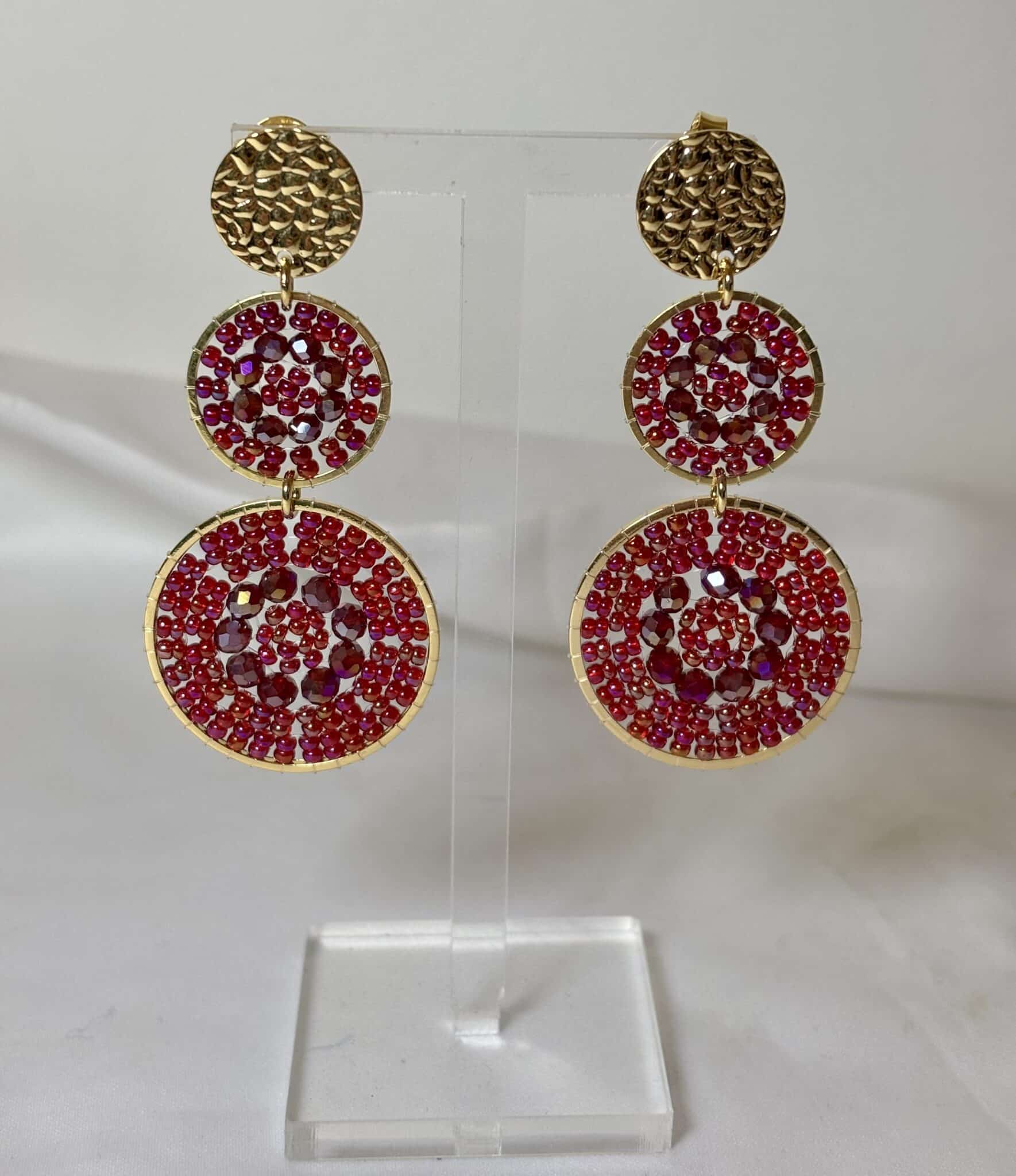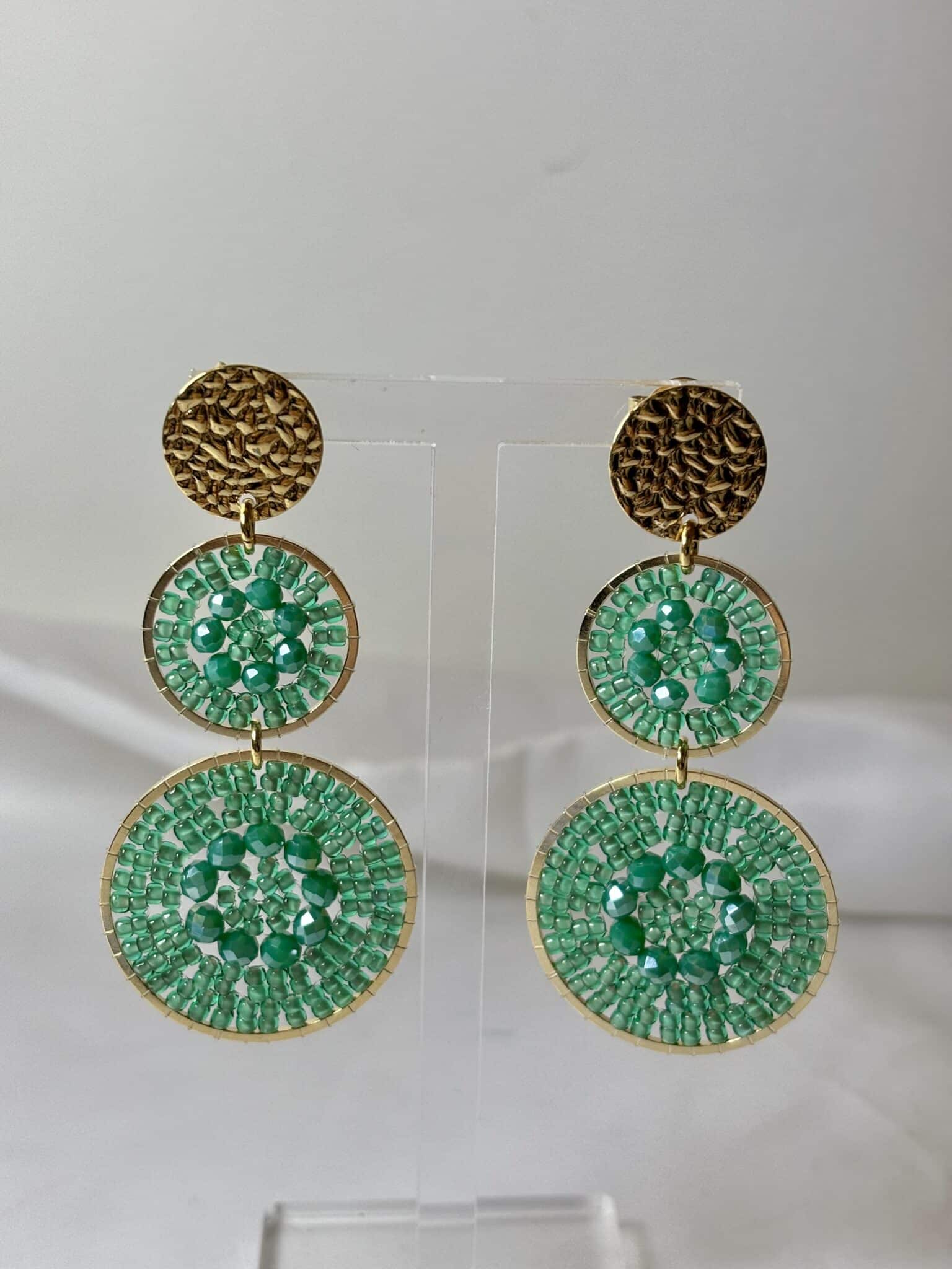 Les boucles d’oreilles Santiago de chez Santibé sont façonnées à la main, mêlant avec élégance perles de verre et plaqué or martelé.