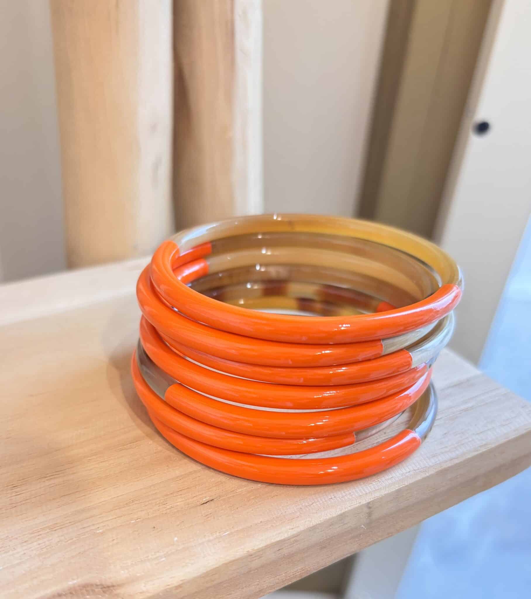Bracelet iconique ATELIER1811, ce jonc fin en corne naturelle partiellement laquée de couleur se porte seul, en accumulation ou en mix avec d’autres bracelets colorés en corne naturelle.
