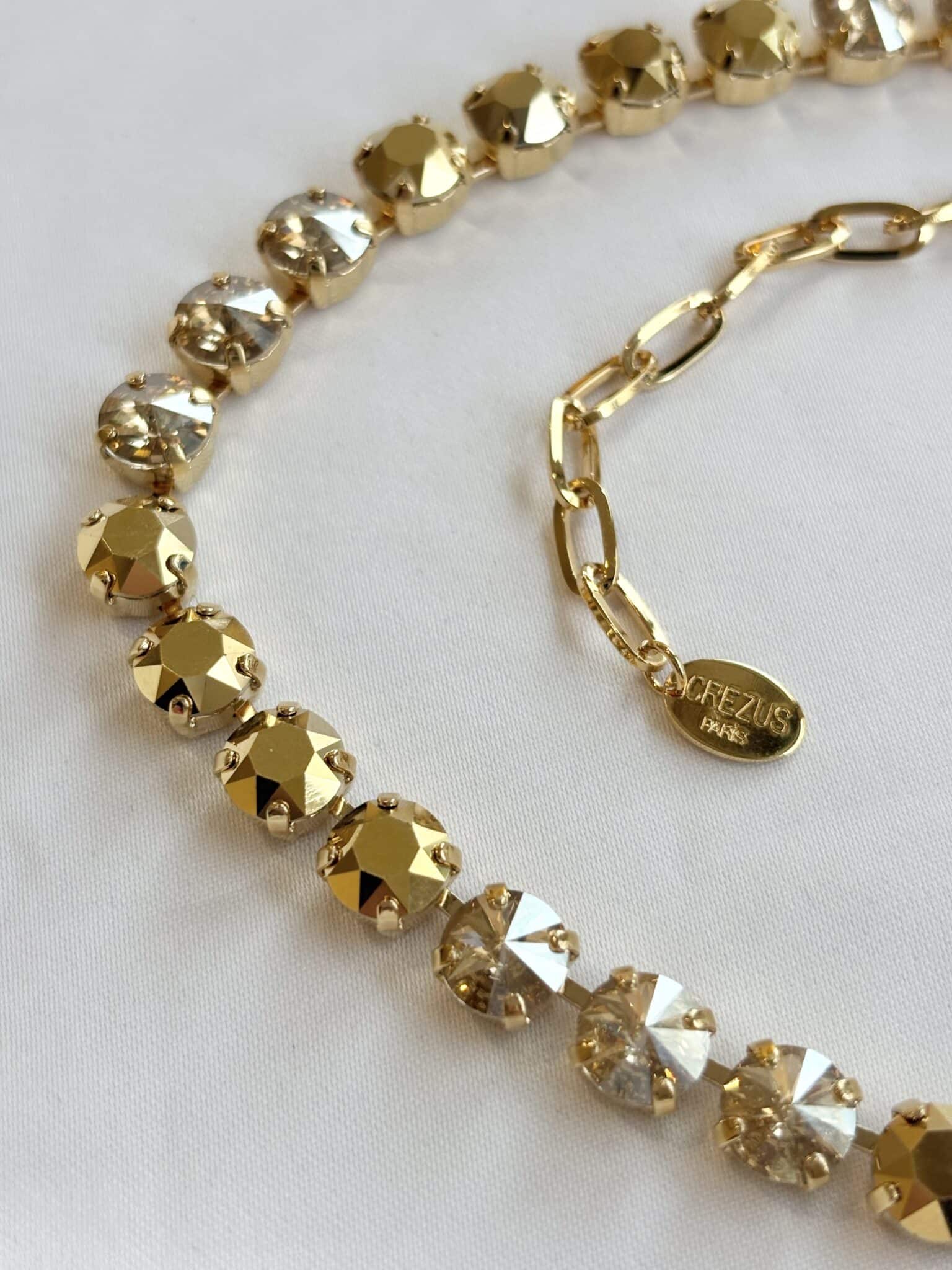 Élégant et lumineux, le collier Crezus Paris est orné de cristaux Swarovski qui captent délicatement la lumière. Entièrement réalisé à la main dans un atelier parisien, il reflète un savoir-faire artisanal et un style raffiné.