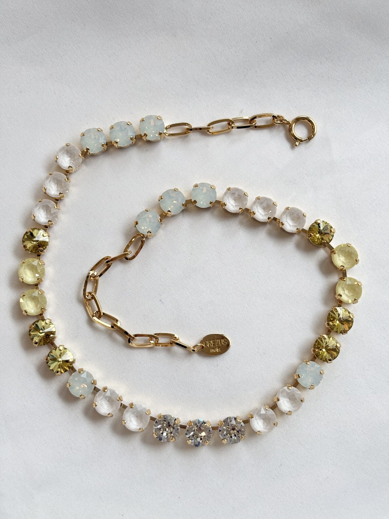 Élégant et lumineux, le collier Crezus Paris est orné de cristaux Swarovski qui captent délicatement la lumière. Entièrement réalisé à la main dans un atelier parisien, il reflète un savoir-faire artisanal et un style raffiné.
