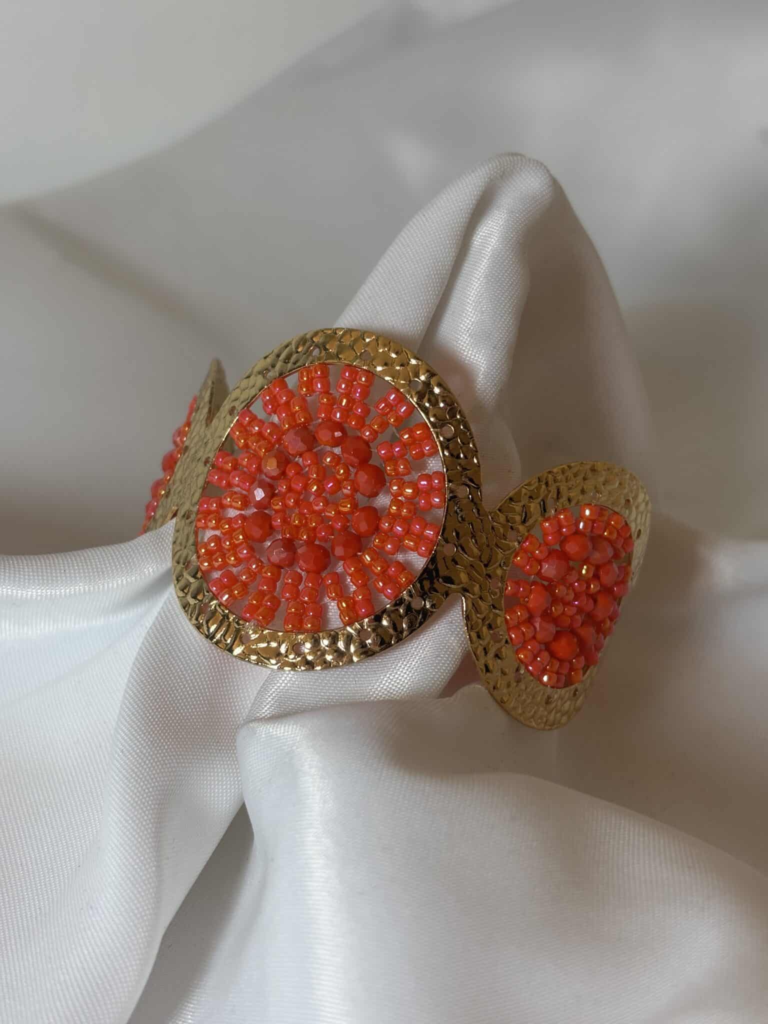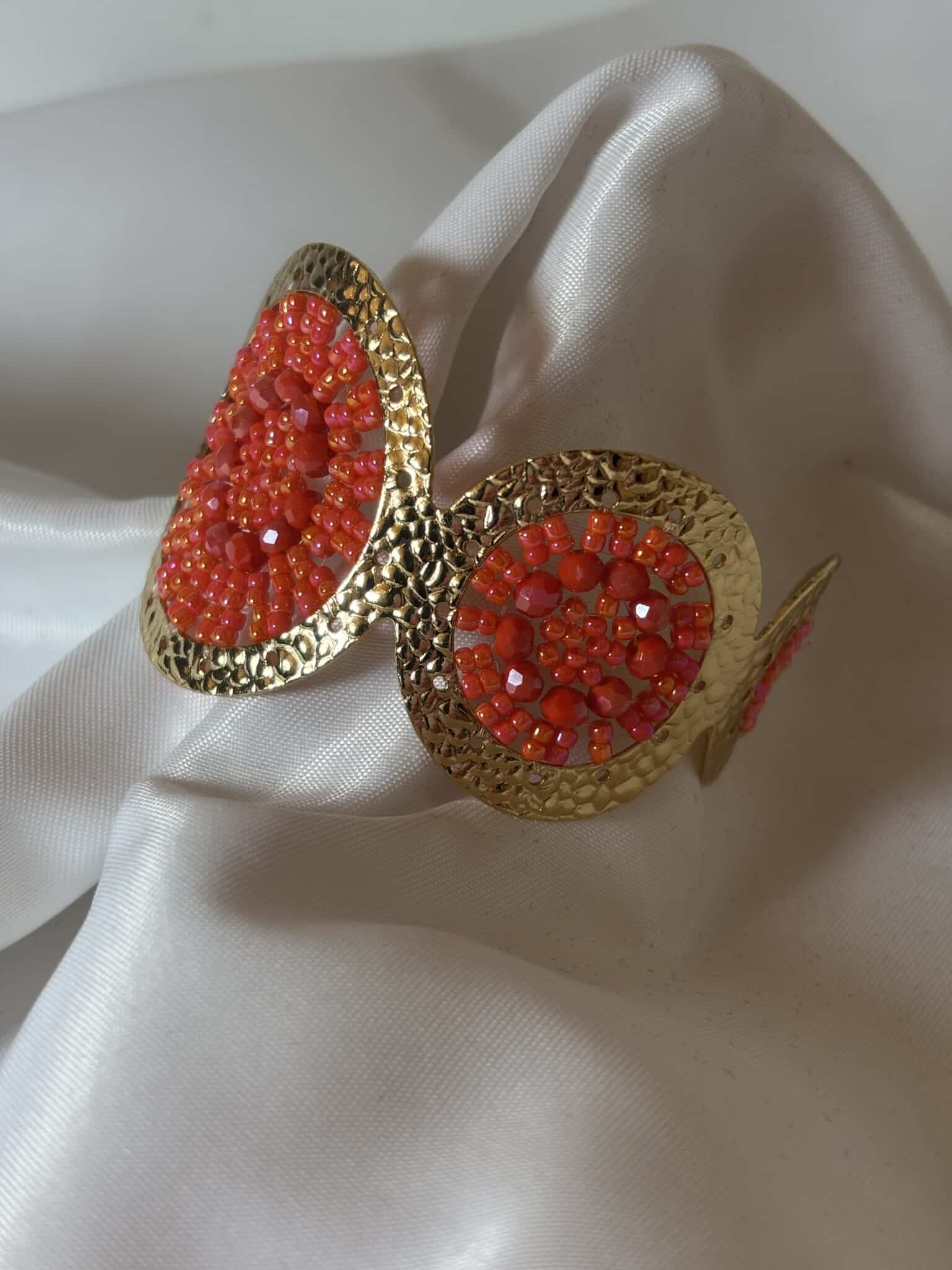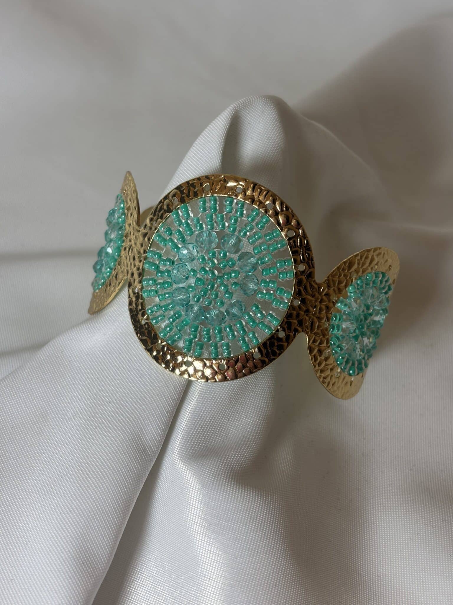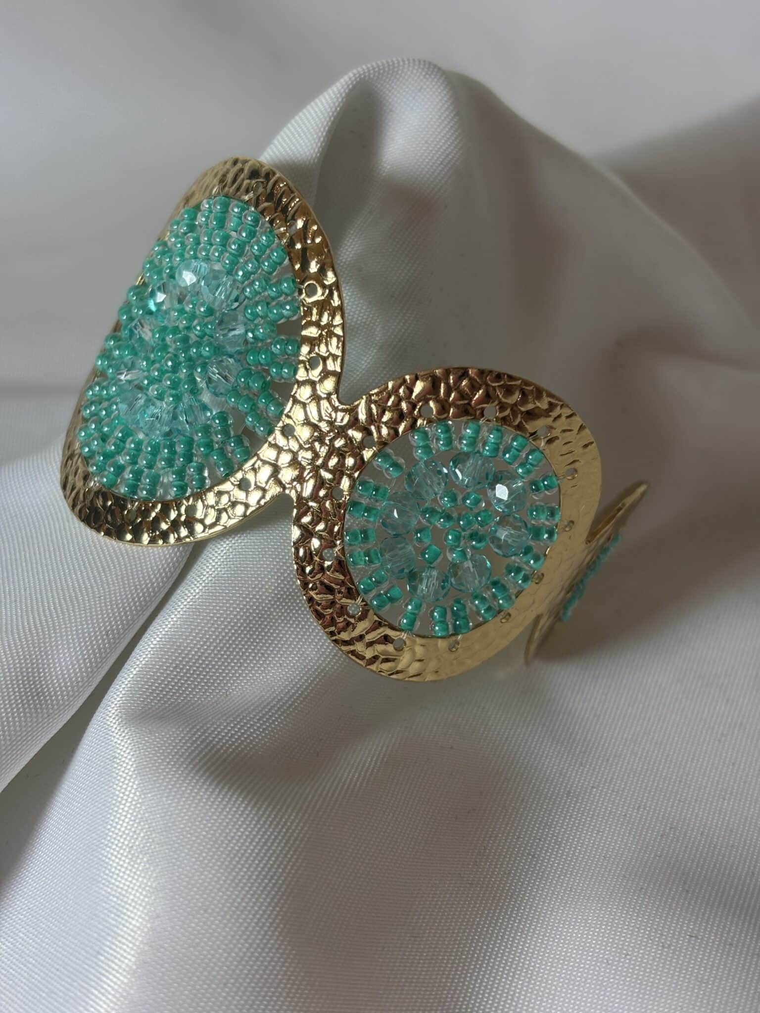 La manchette Ushuaia de chez Santibé est une pièce élégante, martelée en plaqué or et ornée de perles de verre.