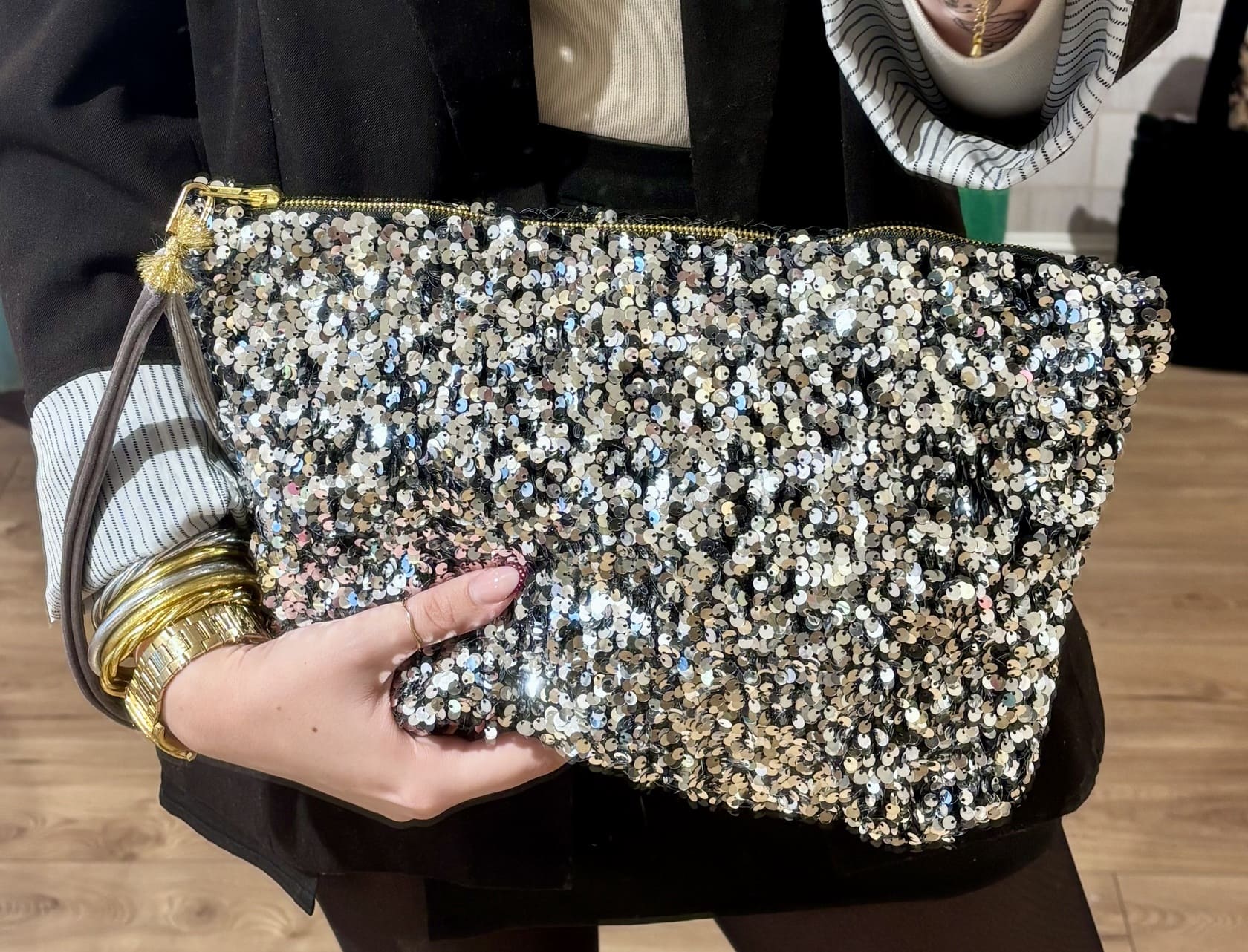 La pochette Eden de la créatrice Lilou apporte une touche lumineuse et originale à votre tenue grâce à son tissu en sequins scintillants. À la fois élégant et pratique, il accompagne facilement vos journées comme vos soirées.